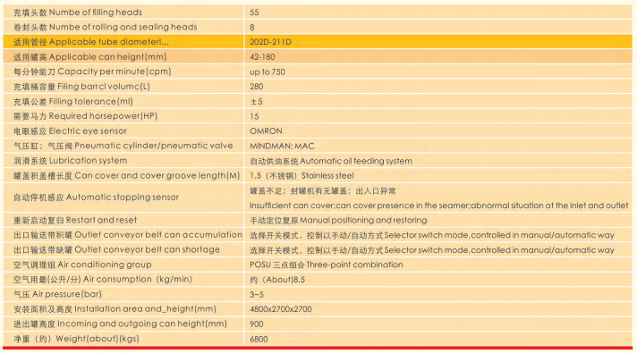 易拉罐灌裝封口組合機 我公司根據(jù)業(yè)內大、中型罐頭廠、飲料廠實際情況,參照瑞士的灌裝、封罐同類產品而設計制造的新型灌裝、封罐組合機。采用無罐身接觸的氣動控制自動下蓋,采用等液面灌裝技術,生產能力為變頻調速,外觀材料95%以上為不銹鋼,保證了整機的美觀和衛(wèi)生要求。為提高罐內真空度,可按客戶要求配置蒸汽噴射裝置,對客戶的技術支持可配備遠程監(jiān)控系統(tǒng)。