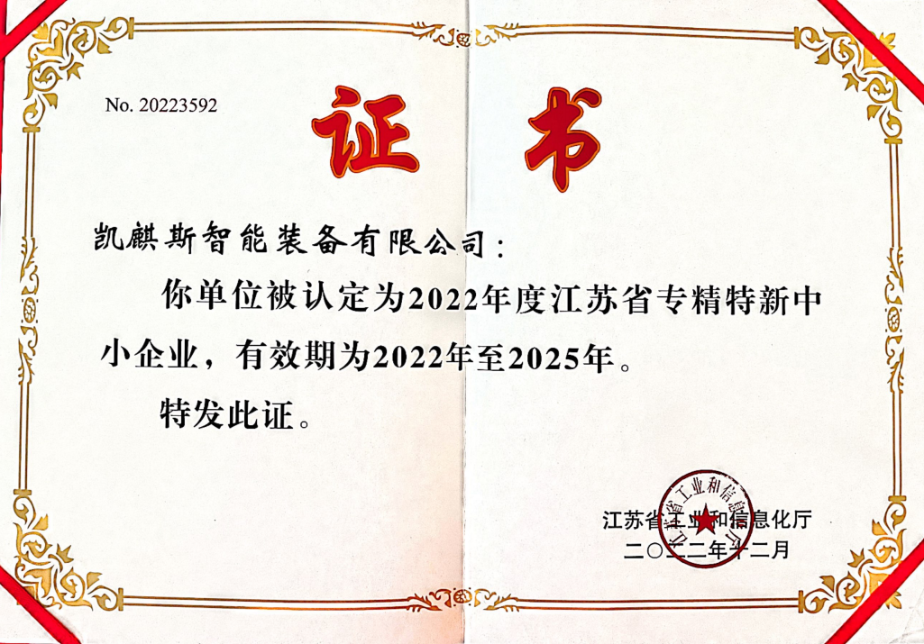 近日,從江蘇省工信廳傳來(lái)好消息,凱麒斯榮獲2022年度江蘇省專精特新中小企業(yè)認(rèn)定,這是2022年繼榮獲江蘇省工業(yè)設(shè)計(jì)中心后的又一項(xiàng)高質(zhì)量認(rèn)證,更展現(xiàn)了政府部門(mén)對(duì)公司科技創(chuàng)新能力及企業(yè)發(fā)展實(shí)力的高度認(rèn)可,有利于進(jìn)一步提升企業(yè)科技的行業(yè)地位和市場(chǎng)競(jìng)爭(zhēng)力。