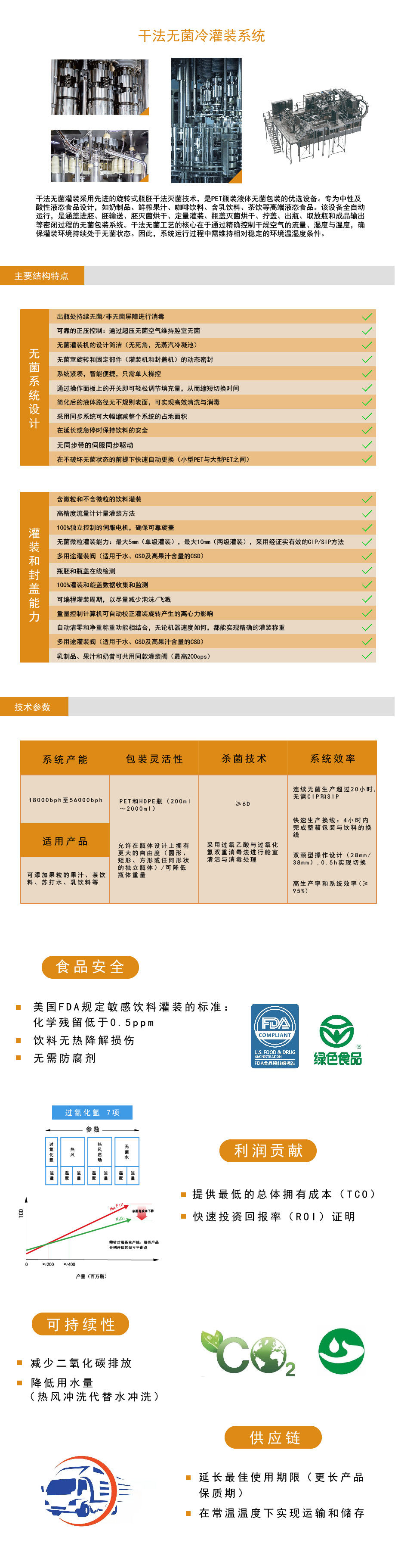 干法無菌灌裝采用***的旋轉(zhuǎn)式瓶胚干法滅菌技術,是PET瓶裝液體無菌包裝的優(yōu)選設備。專為中性及酸性液態(tài)食品設計,如奶制品、鮮榨果汁、咖啡飲料、含乳飲料、茶飲等高端液態(tài)食品。該設備全自動運行,是涵蓋進胚、胚輸送、胚滅菌烘干、定量灌裝、瓶蓋滅菌烘干、擰蓋、出瓶、取放瓶和成品輸出等密閉過程的無菌包裝系統(tǒng)。干法無菌工藝的核心在于通過***控制干燥空氣的流量、濕度與溫度,確保灌裝環(huán)境持續(xù)處于無菌狀態(tài)。因此,系統(tǒng)運行過程中需維持相對穩(wěn)定的環(huán)境溫濕度條件。