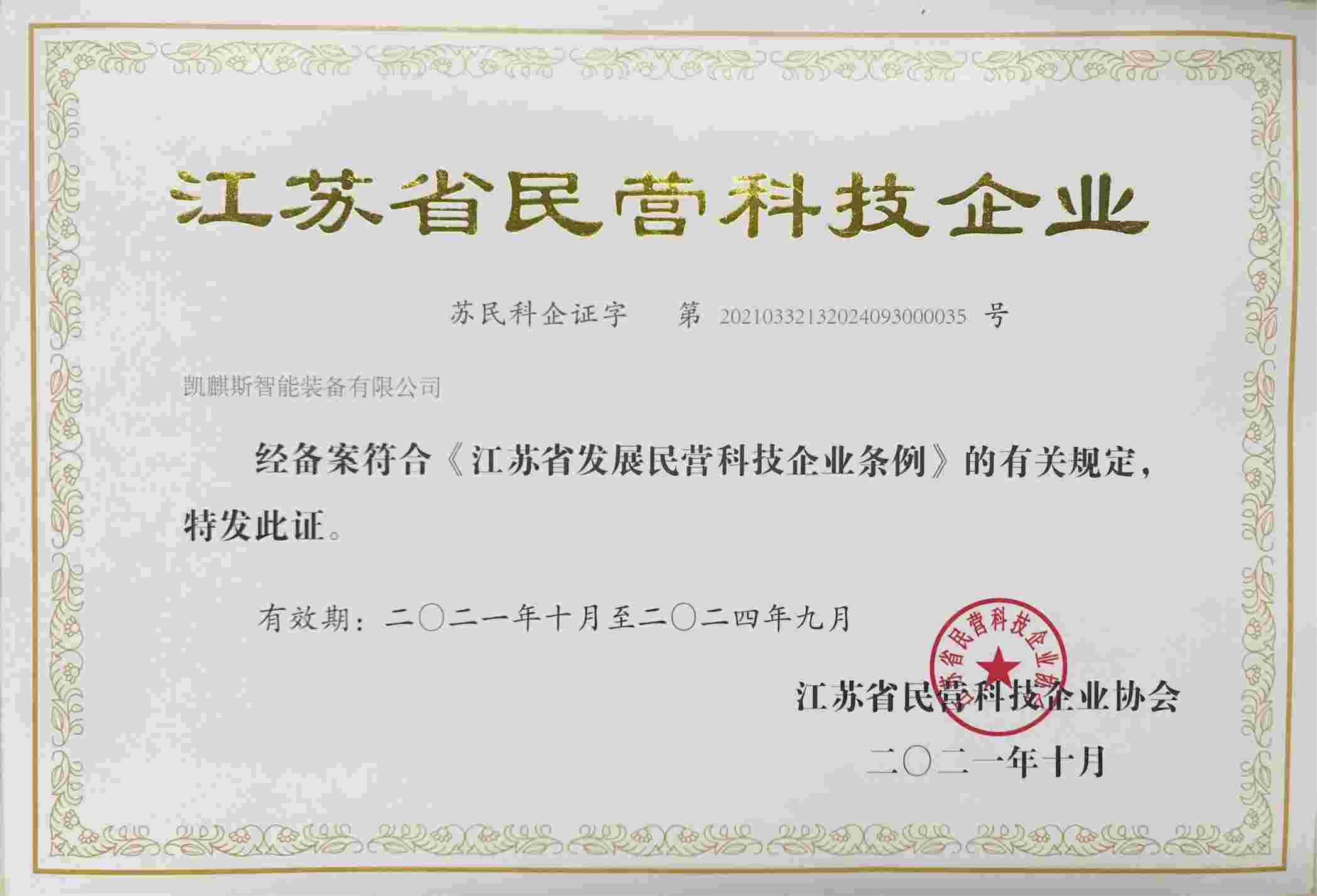 近日,凱麒斯榮獲由江蘇省民營科技企業(yè)協(xié)會發(fā)布的江蘇省民營科技企業(yè)稱號。